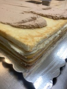 The cake, vanilla chiffon with vanilla American style buttercream filling and chocolate American style buttercream icing, was created by our chef instructors while students aided in the decoration by practicing techniques for building the cake, coloring icing, and constructing buttercream roses.