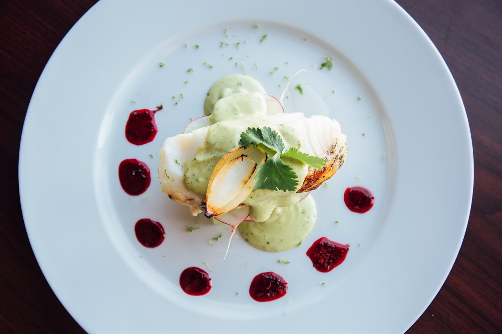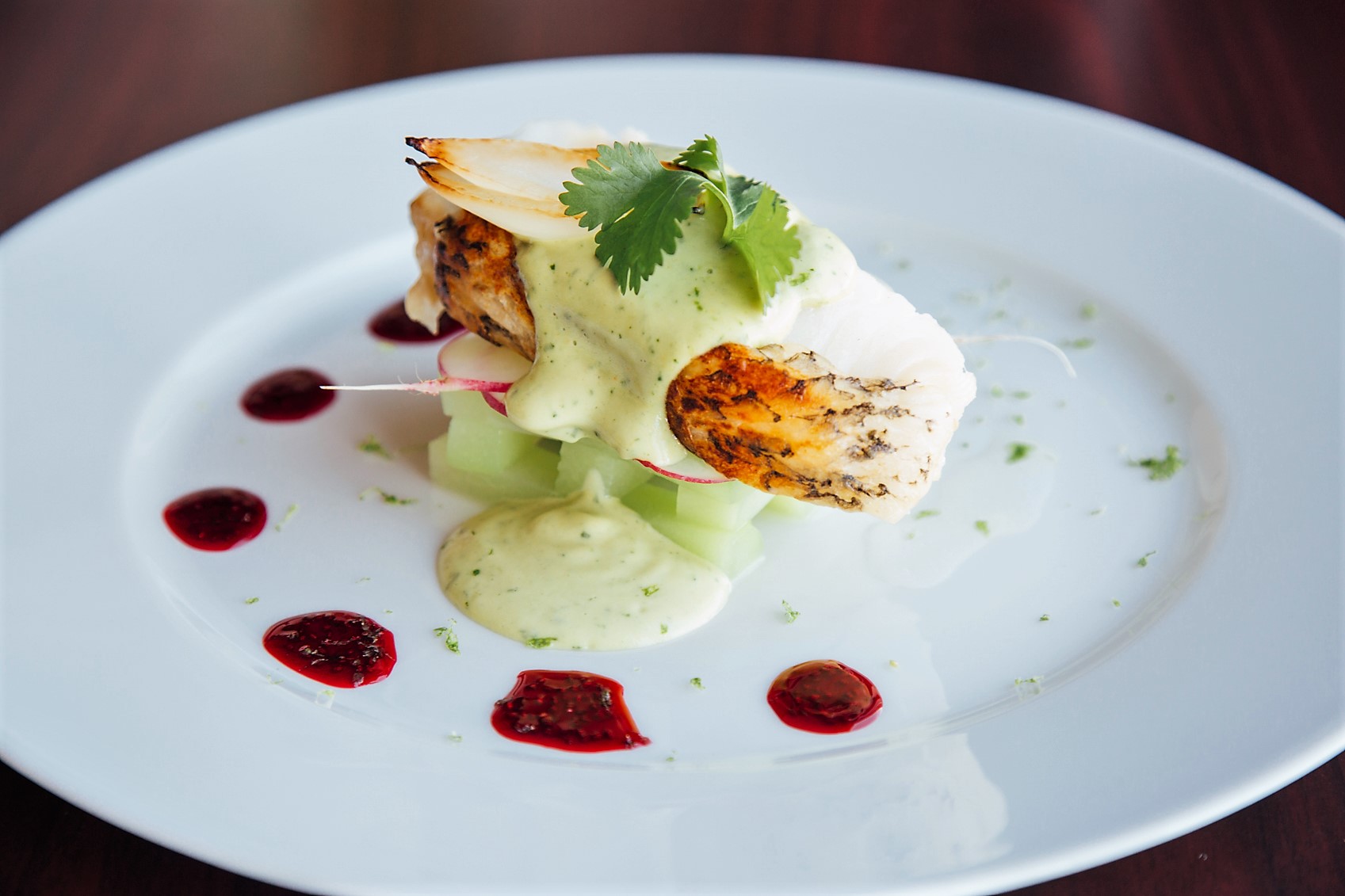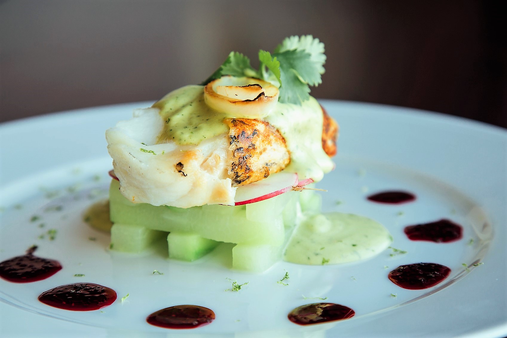 Served with oven-baked sea bass with Mexican chayote and a hibiscus chia seed gel