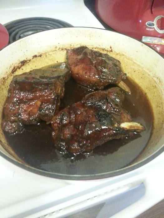 The next day, take out your ribs and put them in an oven-safe vessel big enough to fit them all relatively snugly, and which has a top. Once they’re all inside, sprinkle the rest of the rub over the top of them, and then gingerly pour your 12 oz beer between the cracks in the ribs, trying not to wash the rub off of them. Some rub will bite the dust and that’s okay, just try to keep it to a minimum. Tuck your garlic down into the beer as best you can and sprinkle the rest over the top. Cover in aluminum foil and put in a 250 degree oven until done. It should take 3-4 hours, but you can tell they’re done when you can grab a bone, twist it, and the meat is no longer clinging to the bone. Leave yourself a fair amount of time, because ovens vary and it might take longer.