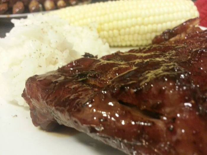 Just before serving, put your ribs in the bubbling sauce to warm them up and coat them, and then serve. This recipe is designed for use with one rack of ribs, which feeds three normal people or two big eaters. Adjust your recipes accordingly depending on the number of guests. This recipe is also designed to be made without a grill, so it’s not really “barbecue.” However, if you make them ahead of time, you can always pull them out of the fridge and warm them up on the grill while brushing the syrup over them, getting some nice smoky flavor. You can always serve this with some corn on the cob and potato salad, making a sort of picnic out of the game, but the sides are entirely up to you.